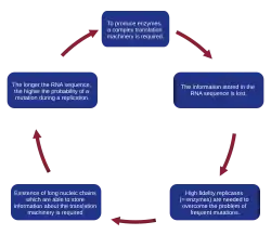 When a model of replicating molecules was created,[1][2] it was found that, for effective storage of information, macromolecules on prebiotic Earth could not exceed a certain threshold length. This problem is known as the error threshold problem. It arises because replication is an imperfect process, and during each replication event, there is a risk of incorporating errors into a new sequence, leading to the creation of a quasispecies. In a system that is deprived of high-fidelity replicases and error-correction mechanisms, mutations occur with a high probability. As a consequence, the information stored in a sequence can be lost due to the rapid accumulation of errors, a so-called error catastrophe. Moreover, it was shown that the genome size of any organism is roughly equal to the inverse of mutation rate per site per replication.[16][17][18] Therefore, a high mutation rate imposes a serious limitation on the length of the genome. To overcome this problem, a more specialized replication machinery that is able to copy genetic information with higher fidelity is needed. Manfred Eigen suggested that proteins are necessary to accomplish this task. However, to encode a system as complex as a protein, longer nucleotide sequences are needed, which increases the probability of a mutation even more and requires even more complex replication machinery. This vicious circle is known as Eigen’s Paradox (see: figure 2).[3]