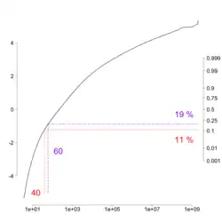 We further assume that the time between major nuclear crises follows an exponential distribution. Standard censored data analysis for one observed and one censored time as discussed here leads to an estimate of 57 years as the mean time between nuclear crises using standard maximum likelihood techniques, as outlined in Appendix 1 below. Uncertainty in estimating the time between such crises was modeled using the Bayesian posterior assuming an improper prior locally uniform in the logarithm of the mean time to the next major nuclear crisis. The accompanying normal probability plot shows the results of 10 million simulated times to nuclear Armageddon based on these assumptions. The estimates of 11 and 19 percent as the probability of a nuclear Armageddon in the next 40 or 60 years, respectively, are marked on this plot. This justifies the numbers given in the introduction above.[19]