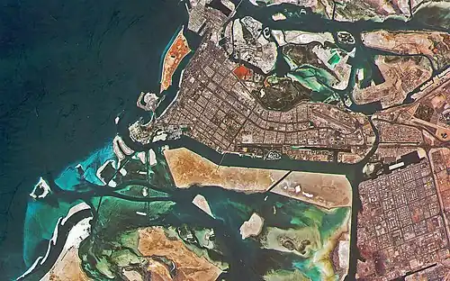 Most of Abu Dhabi is on a wedged-shaped island that lies from northwest to southeast, connected by three bridges to the mainland, and other bridges to other islands, most of which also eventually connect to the mainland. The main island features many 'superblocks' with wide, multi-lane roads dividing them and buses running routes along them. The other islands include: