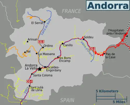 From La Seu d'Urgell in Spain, a 10-kilometre (6.2 mi) ride with a moderate climb of some 150 m (490 ft) of elevation leads to the border of Andorra. There is no dedicated cycle path to the border. You'd ride on the wide shoulder of a somewhat busy highway with cars passing by at a respectful distance. From the border it's another 10 km (6.2 mi) and another 150 m (490 ft) climb to the capital Andorra La Vella.
