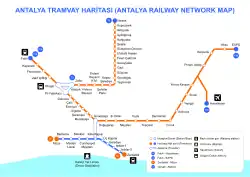 AntRay Line T1 runs from Fatih in the north of the city to the Otogar (transfer to Line T3), İsmetpaşa downtown (transfer to Line T2) and Meydan then northeast to Yonca Kavşak. Line T1A there forks for Airport Terminal 1, Line T1B continues out to Aksu and Expo. Trams run every 15 min 06:00-00:00.
