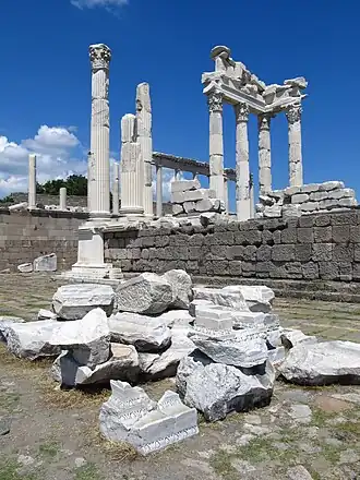 - 🌍 Acropolis, Akropol Cd (See "Get around"), ☏ +90 444 6893. Daily 08:30–17:30. This extensive site is the main reason to visit Bergama and will take a couple of hours to explore. The only ticket sales point and entrance is at the top by the cable car station; accordingly the sights are described here north to south. Most date to 2nd century BC, when an ancient higgledy-piggledy settlement was beautified by Eumenes II and Attalus II to try to outshine Athens. The Arsenal at the north tip of the site is scrappy and you only go that far for the views. The Altar to Zeus measures some 35 x 33 m and may have been the "Satan's seat" that St John raged against in Revelation. It was decorated by an ornamental frieze depicting the war between the giants and the Olympian gods. In the 19th century thousands of frieze fragments were re-assembled in the Pergamon Museum of Berlin: what's here is a replica, and naturally there's a campaign to reclaim the original. South of the altar is the upper agora or market place, and the sparse remains of a temple to Dionysus. The structures near the entrance gate are Heroons (tombs of heroes), the stumps of a propylon (monumental gate) and the low-lying remnants of the Temple of Athena. That temple's north side is the likeliest site of the Library of Pergamon, which held 200,000 scrolls, and sought to rival the Great Library of Alexandria. The scrolls were on parchment, forerunner to paper, much easier to handle than papyrus and breaking the Egyptian grip on that product (indeed the name "parchment" derives from Pergamon, though it wasn't invented here). The library fell into disuse after the Roman takeover of 133 BC: Antonius gave the contents to Cleopatra as a wedding gift, probably to re-stock her damaged library in Alexandria. The Theatre of Pergamon is a very steeply-raked amphitheatre with seating for 10,000. The terrain was too steep for a permanent orchestra or stage, so a temporary wooden stage was erected for performances. Built in the 3rd century BC, this is the oldest of the city's theatres but the best preserved. The Temple of Trajan just south of the theatre was started by Trajan circa 110 AD and completed by his successor Hadrian. It's been extensively restored, the sort of elegant Corinthian marble columns you depict on banknotes. That concludes the Upper Acropolis, now descend south. Building Z, halfway down the slope, has beautiful mosaics. Lower Acropolis is less preserved and suffers by comparison to what you've already seen: if you drove up, it's time for one of you to re-ascend the site to bring the car round to the lower gate. Down here are the Temple of Demeter and the Temple of Hera. The Gymnasium complex is on three levels, with the boy novices practising at the base and the top jocks showing their moves and muscles on the upper deck. The Gate of Eumenes II is a fortification tower, and the House of Attalos has mosaics. Exit via the gate in the lower agora, to find yourself back near the city centre. 340 TL (about €11).