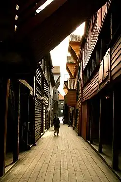 - Bryggen (the German or Hanseatic wharf) on the East shore of Vågen, this is the historical centre (including Øvregaten/Lille Øvregaten streets)