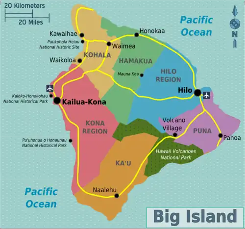 The youngest and largest island in the Hawaiian chain, the Big Island contains five volcanoes, including Kilauea, one of the world's most active. It is an island with a long coastline of black, volcanic sand beaches where you may see leatherback turtles and a host of other marine life, and a large, sparsely-populated mountainous interior. Hawaii has a relaxed, rural and small-town atmosphere, and even the biggest city, Hilo, is neither very big nor heavily built-up. There are no freeways on the island, speed limits are low and drivers tend to drive under the speed limit. The Kona (west) side of the island, famous for its coffee, is the more touristy and drier side; the lush Hilo/Hamakua Coast (east) side gets about 180 inches of rain annually, the wettest in the 50 states, and is much less touristy, but the rain is often steady rather than torrential and may not last all day. In the interior, there is some great hiking, including the Kilauea Iki Trail in the unique Volcanoes National Park, where you can also safely peer into the caldera of Mt. Kilauea at night and see the lava glowing bright red and starting to solidify into rock as it's exposed to the air; also awaiting you in the interior is the unparalleled experience of viewing the Milky Way and the rest of the night sky from Mauna Kea, one of the clearest and least light-polluted locations in the world, though not without controversy, as many Native Hawaiians consider the Observatory on top of this dormant volcano to be a desecration of a place holy to Pele, the Volcano Goddess.