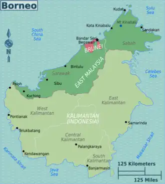 | Kalimantan (Central, East, South and West) the Indonesian part, occupying the central and southern regions |