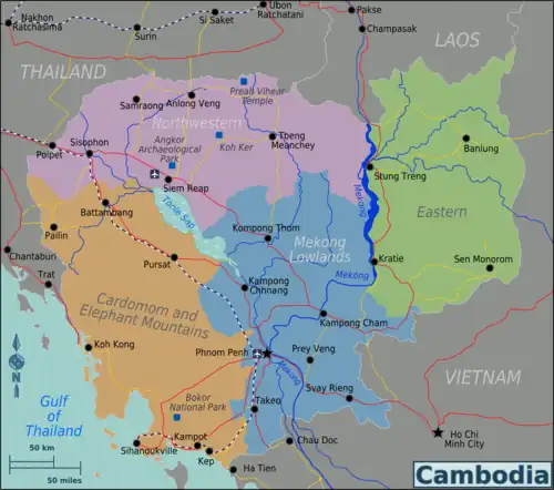 The Kingdom of Cambodia (កម្ពុជា kampuciə) is in Southeast Asia. While the Angkor Wat commemorates Cambodia's glorious history, the country has been ravaged by colonialism, the Indochina Wars, and the Khmer Rouge regime, and remains one of Asia's poorest countries. However, in the 21st century, the country is getting back on its feet, and is today one of Asia's most popular tourist destinations.