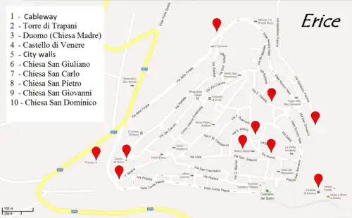 Erice is a village in the province of Trapani on Sicily in Italy. Fewer than 500 people live in the old medieval fortification which is uniquely located on top of the 715-m-high Erice mountain. The city has wonderful views. On a clear day, the Mount Etna volcano, on the other side of the island, can be seen.