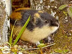 The Norway lemming (Lemmus lemmus) mostly lives in the mosses of tundra and treeless fells of northern Fennoscandia and the Kola peninsula, with large tunnel systems beneath the snow in winter. The lemmings are known for their dramatical mass migrations; in years with large populations, the surplus move in random directions looking for vacant territory, sometimes funnelled into some narrow corridor where a mass panic can follow.