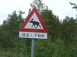 The elk (Alces alces, known in North America as the moose) is the largest deer. It is endemic in the Nordic countries, the Baltic states, and the Russian taiga. In these regions, it is the most dangerous animal in animal collisions. The road warning signs are iconic to roads in Sweden and Finland, and sometimes stolen by reckless visitors.