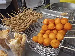 Arguably Filipino streetfood is one of the best however it may not be as clean as the ones you find in Singapore. Streetfood vendors have been criticized because of their unhygienic practices as well as unhealthy options but praised by many especially the youth because of its affordability and taste, nowadays streetfood is also found in malls but the traditional way of street vending still hasn't died out. Items are sold for as low as ₱5. Street food is usually enjoyed with beer, soda, juice or even gulaman (pearl shakes) and is usually eaten during the afternoon till night.