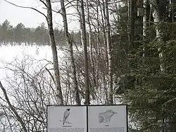 Information board by a nature trail, telling about the probable inhabitants of the nest box