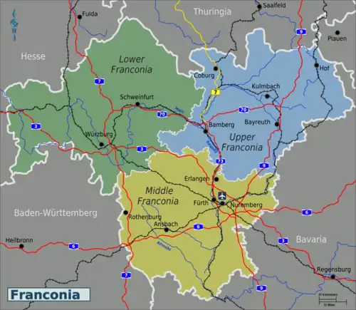 Franconia used to be comprised of many independent principalities and petty duchies and knighthoods until it became part of Bavaria around 1806 (different territories were annexed by the Wittelsbachs at different times but 1806 is the commonly accepted "overall" date) as a result of the Napoleonic Wars. This has two main consequences: first, the dialect and religious composition of two neighbouring villages may be notably different (which used to cause tensions but is now of mostly folkloric interest); second, there is still some resentment towards Bavaria and many people do not like to be lumped together with their "colonisers" down south. While you will not encounter open hostility, try to avoid calling Franconians Bavarian. Many people also include part(s) of adjacent Länder in Franconia as they are linguistically, culturally and historically more connected to Franconia than to the Länder to which they belong in terms of administration. Those regions include: Sonneberg and Thüringen south of the Rennsteig (in fact Sonneberg voted to join the Nuremberg Metropolregion and there are talks of switching Bundesland) and the region of Baden-Württemberg called Heilbronn-Franken. On the other hand places like Aschaffenburg are linguistically close to neighbouring regions. Coburg in turn was one of the several petty states that were considered "Thuringia" prior to its creation in early Weimar times, but decided in a 1920 referendum to join the state of Bavaria rather than Thuringia, in part due to feeling more Franconian than Thuringian. In short, the cultural borders are a bit fuzzy around the edges.