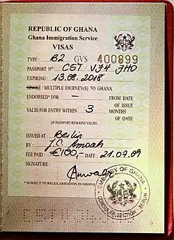 There is no such thing as a visa on arrival for Western countries. It's thus best to play it safe and get a visa in advance. The Ghanaian government's online Ghana list of embassies is out of date. A three-month single-entry visa costs US$60; a one-year, multiple entry visa costs US$100. You must have a yellow fever vaccination certificate which will be presented to customs when entering.
