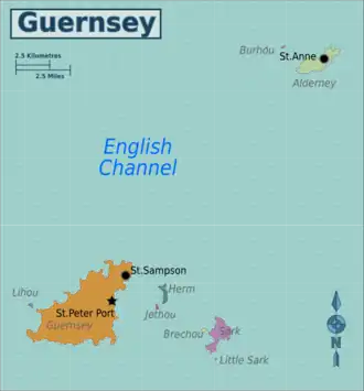 The Bailiwick of Guernsey (French: Guernesey, Guernesiais: Guernési, Sercquiais: Gyernëzi) is a group of islands in the English Channel, part of the Channel Islands. Guernsey is the main island, some 50 miles west of the Cotentin Peninsula in France. It's about 6 miles long by 3 miles wide, with St Peter Port as its chief settlement, and in 2019 had a population of almost 63,000.