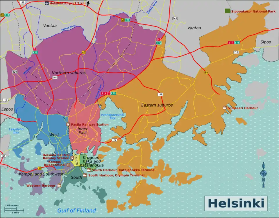 | Northern suburbs The northern parts of Helsinki, which was once known as a separate rural municipality of Helsinki, now consists of highways, shopping malls, industries and residential buildings, plus quite a bit of greenery in-between. It connects seamlessly to the next city north of Helsinki: Vantaa. While not as culturally interesting as the other parts of Helsinki, it offers some natural attractions like the Central Park and Helsinki's highest point Malminkartanonhuippu. |