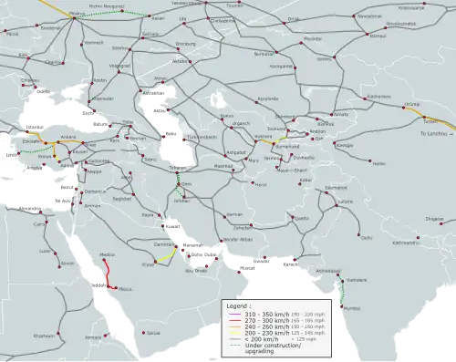 A 334 km (208 mi) line links three major cities in Uzbekistan. From the capital Tashkent, trains travel at speeds of up to 250 km/h (160 mph) to Samarkand and Bukhara. Trains are operated on the Russian gauge by Uzbekistan Railways.