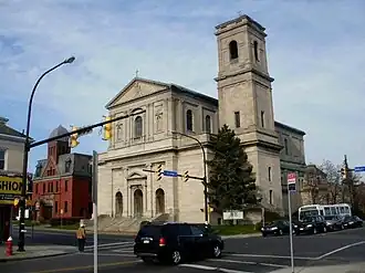 - A few years back, 🌍 St. Gerard Catholic Church (1190 E. Delavan Ave.) made national headlines because of a unique redevelopment proposal that divided Buffalo's preservationist community: a Catholic congregation from Georgia wanted to disassemble the building into pieces, ship it 900 miles (1,450 kilometers) south, and reassemble it for their own use. Founded in 1902, St. Gerard's is an anomaly: the parish it was built to serve was mostly Italian, in sharp contrast to the German and Polish constitution of most of the East Side—and its impressive Italian Renaissance architecture, whose debt to St. Paul Outside the Walls is much more obvious at first glance than St. Luke's, definitely mirrors the demographics of its early worshipers. The work of the local firm of Schmill & Gould, St. Gerard's is a solid-looking structure of Indiana limestone whose main façade faces Bailey Avenue. You'll notice handsome symmetry and a strong debt to Greco-Roman Classicism there, where a trio of round-arched entrances are flanked by Ionic pilasters and, in the case of the main door, a proud triangular pediment. On the second floor there are niche statues of the church's namesake, Saint Gerard Majella, as well as Saint Joseph—two prominent figures in Italian Catholic culture—that are the work of local sculptor Angelo Gatti. Those are flanked by still more pilasters: two Corinthian ones on both sides of each niche, while in the center a small but lovely round-arched stained-glass window is surrounded by Ionic pilasters, a handsome ornamental balustraded balconet, and a rounded recessed pediment. In sharp contrast to the church is the former St. Gerard's School building next door, a red-brick Romanesque Revival structure with a stout central tower; the Syrian arch that crowns its entrance is mirrored by a smaller one on the lintel above the third floor's central Palladian window. It's been converted into apartments.