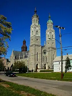 - St. Stan's current church building—the second one to stand on the site—was erected in 1882 from a design by architect T. O. Sullivan, and with its imposing twin steeples towering 217 feet (66 meters) above Peckham Street, it's a particularly majestic example of the Polish Cathedral Style of Romanesque Revivalism that you'll be getting very acquainted with in this next stretch of the tour. The locally-sourced (probably from the Lewis Bennett quarry) gray Onondaga limestone of the exterior walls is accentuated by trim in lighter-colored Lockport limestone. You'll also notice the parade of saints crowning the buttresses on the sides of the building—among the statues are many Polish religious figures including Saint Adalbert and Saint Hyacinth of Kraków—as well as the octagonal cupola above the apse that echoes the ones atop the steeples. If you're lucky enough to get a chance to go inside, you'll also bear witness to some of the most exquisite work of prolific local ecclesiastical artist Jozef Mazur.