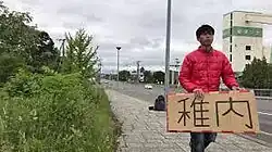 Brightly-coloured jacket, big sign... this guy will get to Wakkanai