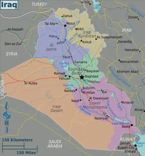 | Southern Iraq The Cradle of Civilization itself, home to major Shia cities and holy sites, such as Karbala, Najaf, Basra, and Nasiriyah, as well as legendary ruins of ancient civilizations, including Babylon and Sumerian Ur. Also known as Lower Mesopotamia. It also serves as Iraq's main access to the sea. |