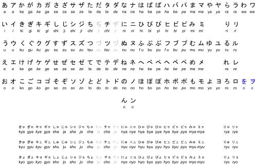 Katakana are used to write foreign and loanwords (except for those from Chinese, which are written in kanji) and are hence a good choice for travellers to learn. The katakana set of characters encompasses exactly the same sounds as hiragana; they only look different. The table on the left only reproduces the basic character set and diacritics (カ → ガ). Combinations (キャ) apply just as for hiragana. One additional sound though is ヴ vu and combinations like ヴェ ve based on it, accommodating additional foreign sounds. Every once in a while you may spot additional ingenious combinations or use of diacritics.