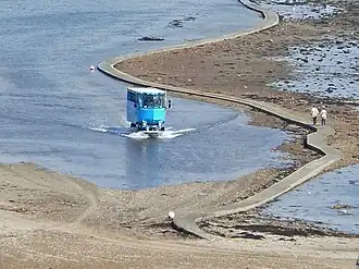 - 🌍 Elizabeth Castle, St Aubin's Bay JE2 3NU, ☏ +44 1534 723971. Apr-Oct: daily 10AM-5:30PM. Castle on a tidal islet, built from the 16th century when the stronghold at Mont Orgueil became vulnerable to improving cannon power. It was built over a confiscated abbey, and saw action during the English Civil Wars, and the Seven Years War with France. A barracks was also built, but the site made them sitting ducks so the garrison was moved to Jersey main island. South side of the islet is the 12th-century hermitage built where, according to legend, Saint Helier lived. At low tide you walk to the castle across a causeway, at high tide you take the "ferry", which is a pair of amphibious vehicles - see website for tide times. The kiosk for ferry tickets is on the slipway directly opposite the Grand Jersey Hotel - don't follow signs for "Port Elizabeth Ferry Terminal" which is for the big ferries to the mainland. Assistance dogs only. Adult £13.25, child or student £8.60, senior £11.90, + £3 ferry; Jersey Heritage Pass includes ferry.