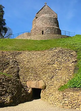 - 🌍 La Hougue Bie, Grouville JE3 9HQ (Bus 13, 21), ☏ +44 1534 853823. Apr-Oct: daily 10AM-5PM. An eclectic mix of structures, with the kernel of it a Neolithic passage grave, in use circa 3500 BC. The passage is 18.6 m long, astronomically aligned so that equinox sunrises penetrate the deepest chamber (a common Neolithic design, though their alignment is usually solstice). "Hougue" means heap and, not to let a good heap go to waste, 12th and 16th century chapels were built side by side on top. A neo-Gothic luxury residence was added over the chapels in 1792, justified as a "signalling tower". In the 19th century a hotel was built at the compound gates. "Tower" and hotel were removed in 1924. During the World War II German occupation a bunker was built adjacent, now an exhibition of slave labour under Operation Todt. There's also a modern replica of a Neolithic longhouse. Adult £10.30, child £6.70, senior £9.25, family £30.60, Jersey Heritage Pass valid.