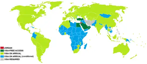 Visitors from most other countries (even Israeli citizens and Israeli passport holders) can easily obtain a visa on arrival at the border point directly, except for the King Hussein ("Allenby") Bridge, where a visa is not issued on spot and must be obtained in advance through the Embassy of Jordan.