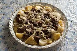 - Laghman - a thick noodle dish with meat, carrot and onion, usually served as a soup.Some other veggies could be added too.
