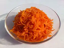 The legacy of Korean resettlement in Kazakhstan means that Korean dishes, particularly salads, are very common. At the country's many bazaars (independent food and goods markets), look for the Korean ladies selling these. They will wrap you up any number of delicious, often spicy and garlicky salads to take away in plastic bags. If you are vegetarian, this may be the only decent thing you get to eat while you're in the country.
