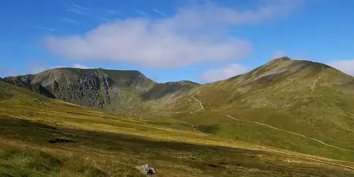The highest is 🌍 Scafell Pike. (pronounced "Scaw-fell") . This "highest" designation leads to a lot of traffic, and visitors who want to experience a high Lakeland Fell may want to choose another. Some of the slightly smaller fells are in fact much more rewarding to climb as well as offering better views. 🌍 Great Gable. and 🌍 Helvellyn. are popular choices. Less well-known hills include Grisedale Pike, Fairfield, and Bowfell.