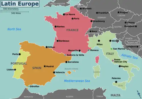 Southwestern Europe is a region in western and southern Europe. It can be referred to as Latin Europe as, generally speaking, Romance languages and Roman Catholic Christianity are endemic, through the heritage of the Roman Empire. The region contains Portugal, Spain, France, Italy and Malta as well as some of Europe's smallest countries: Andorra, Monaco, San Marino, and the Vatican City. These countries have around 180 million inhabitants all told.
