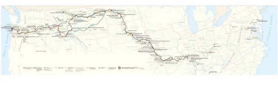 Starting in Illinois, the route follows the Missouri River to the headwaters in the Rocky Mountains, then over the Continental Divide. From there it follows the Clearwater, Snake and Columbia Rivers to the Pacific Ocean near Fort Clatsop Oregon. The expedition paved the way for the wave of colonization known as the "Wild West", and the parallel Oregon Trail.