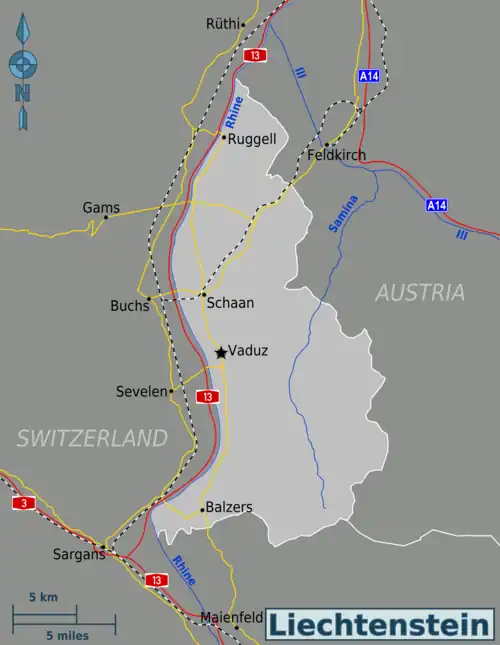 Liechtenstein has no highways, but the Swiss Autobahn A13/E34 runs along the Swiss side of the Rhine River, the border between Switzerland and Liechtenstein. There are several access points that cross the Rhine into Liechtenstein, the two that are most commonly used are the bridge crossing into the southern town of Balzers and the crossing into Vaduz. If you aren't coming from the west or have a Swiss vignette already, it may make sense to avoid Swiss highways as there is only a year vignette.