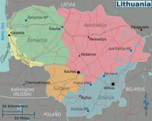 | Aukštaitija (Highlands) (Panevėžys, Kėdainiai, Utena, Kaunas) Northeastern and eastern region; the name means Highlands due to the regions hilly terrain. Considered the cradle of Lithuanian culture, with the purest form of the Lithuanian language and many traditional villages. The region is filled with many lakes and rivers which make it a centre for fishing and water tourism. |