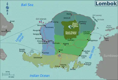 The regions below are presented for the convenience of travellers, but the regencies in Lombok are significantly different: West Lombok Regency, North Lombok Regency, Central Lombok Regency, East Lombok Regency and Mataram City.