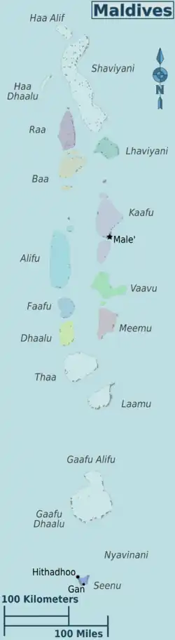 | Seenu (Addu) The southernmost atoll, the second-largest in population and site of Gan International Airport. |