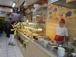 Carinderias sound like Spanish style cooking but there is no relation to it. It's simply a collective term for a working class type of eating stall, now with table and seats for sit-in meals, more as a hole-in-the-wall or a makeshift school canteen (some may have wheels) for the lowly construction worker, the jeepney driver, or the student low and tight on budget. The style of presenting the food (no menus but some have posted menus) is laid out on a glass-covered or open counter in pots or deep square aluminum platters (for the more classy ones) and where the customer can just scan his eyes and choose what he wants. Panaderias are bakeries dispensing bread and pastries. But the line is not clear if they are a separate class of their own or as Street Food. Goldilock's Bakeshop operate as a full-time restaurant but they can have some presence in malls as food stand types. Dunkin' Donuts or Mister Donut also establish their presence as either a shop with dining tables or as a stand-alone stalls.