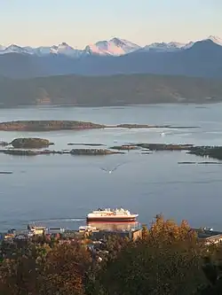 Molde was from the start a main cruise port in the western fjords of Norway, kaiser Wilhelm II visited Molde every year and the kaiser called the pleasant small town "Nice of the North". Today the town is most interesting because of its superb location on a south slope overlooking the great Moldefjord/Romsdalsfjord and the Romsdal alps around Åndalsnes. This view, the "Molde Panorama", includes as much as 222 alpine summits, many of these reach more than 1000 meters above sea level. The wide Moldefjord/Romsdalsfjord with its many islands and surrounded by alpine summits and little bays and smaller fjords is Norwegian landscape on a grand scale.