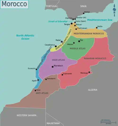Morocco (Arabic: المغرب, Al-Maghrib; Berber: ⵍⵎⴰⵖⵔⵉⴱ, Elmaɣrib; French: Maroc) is the northwesternmost country in Africa. Morocco has, for most people, been the gateway to Africa. With plenty of attractive locations, historical sights, and unique cultural traditions, there's lots to see and do in this beautiful, mesmerising country. At just a few hours from the main European cities, Morocco has everything to overwhelm you with the amazing colours, smells and sounds of Islamic Africa. Imagine bustling souqs and spice markets, stunning mosques, white-washed sea side towns and medieval city centres. With panoramic views varying from snow-covered peaks in the High Atlas to the endless sand dunes of the Sahara, no-one ever has to be bored in this beautiful country.