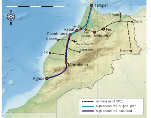 - Line between Marrakech, Casablanca, Rabat, Kenitra, Meknes, and Fez. While this is not a high speed train, much of journey is at 160 km/h.