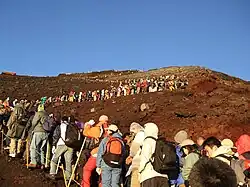 Climbing Mount Fuji is very popular, with around 250,000–300,000 climbers every year. Saturday nights and the Obon holiday period are particularly busy. To beat the crowds, visit on a weekday outside the Japanese school holiday period (which is usually July 20 to the end of August). The government publishes daily and aggregate climber counts for each trail during the climbing season every year to aid planning around popular dates.