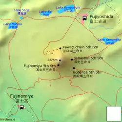 This is the longest and toughest access route from the fifth station, with Gotemba 5th Station (御殿場五合目 Gotemba Go-gōme) located at 1440 meters, nearly 900 meters lower down than Kawaguchiko.