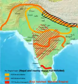 The empire is usually dated from Babur's victory at Panipat in 1526. The light orange line on the map shows its extent at Babur's death in 1530. His successors expanded it greatly, as shown by other lines on the map.