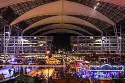- 🌍 Munich Airport Center (MAC) (between terminals 1 and 2). A recreation- and service-centre at the airport between terminals 1 and 2. It includes a shopping mall, restaurants, a medical centre, the conference centre, municon and the MAC-Forum. The MAC-Forum is Europe's largest roofed outdoor area, which is used for various events like a Christmas fair and ice-skating in winter and a beach volleyball tournament in summer.