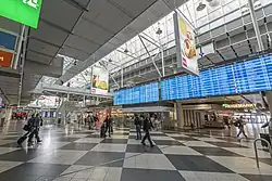 The airport is connected to Munich by suburban train (S-Bahn) lines S1 (via western districts) and S8 (via eastern districts). The train station is located in Terminal 1 on level 2 (underground). If you are heading downtown or to Munich Central Station (München Hauptbahnhof), take whichever train is leaving first, as both take about 45 minutes to reach the city centre. Trains run every 10 minutes or so daytime; S8 also runs all night at reduced frequency.