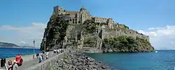 • Ischia (40 km by boat or hydrofoil) is a volcanic island which lies at the northern end of the Gulf of Naples. It is the largest of the Phlegrean Islands. The main industry is tourism, centering on thermal spas that cater mostly to European (especially German) and Asian tourists eager to enjoy the fruits of the island's natural volcanic activity, its thermal hot springs, and its volcanic mud. For many of the inhabitants on the Italian-speaking island, German and English are second languages. This is because of the large number of German- and English-speaking tourists who visit the island each year.