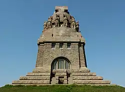 - There is a rather bombastic 🌍 Monument of the Battle of Nations (Völkerschlachtdenkmal in German) in Leipzig. Standing 91 metres tall, it is the biggest monument in Europe. It was erected in time for the first centennial (1913). Despite the nationalistic spirit prevalent at that time (one year before the beginning of World War I), the monument does not glorify war, but laments the lives lost: The giant soldier statues have a sad and weary expression rather than a heroic one, and the water pond in front of the monument is called "lake of tears". Adepts will find numerous Masonic symbols as the architect was a Freemason.