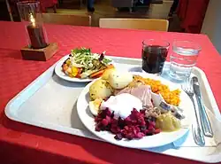 - Smörgåsbord (Danish: det store kolde bord, Norwegian: koldtbord, Finnish seisova pöytä or lounaspöytä), an extensive buffet with bread, herring, smoked fish, cold cuts, warm meats and desserts. Buffets are also popular for breakfast, lunch and dinner on Baltic Sea ferries, especially those between Finland, Sweden and Estonia.
