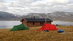- 🌍 Skoaddejávre. Unmanned DNT cabins for 10+2. DNT key, the smaller hut probably unlocked. Hard to find in fog. Boat. Fishing possible if you have the permit. Mobile coverage from Telenor halfway up the fell Juovvačurru east of the huts.